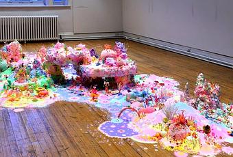 ¿No os recuerdan a las fiestas de cumpleaños que celebrabais de pequeños? ¿Y a las tartas de chuches que eran la envidia de toda la clase? Pip & Pop construyen instalaciones delicadísimas y tan dulces que dan ganas de zampárselas. Pero cuidado, que no son comestibles. Pintura, purpurina, azúcar, pigmentos en polvo, golosinas, plantas artificiales, vinilo, origami, plástico, globos y objetos encontrados por casualidad dan forma a este universo tan original.