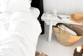 FuenteEn España somos muy de mesitas de noche y lámparas de sobremesa pero esta opción banquito recuperado y cesto es todo un acierto si no necesitas espacio de almacenaje.