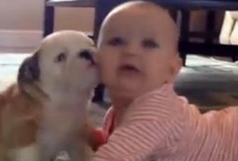 Conmovedor y fascinante, un cachorro de Bulldog juega con este bebé que parece no estar disfrutando mucho de la compañía del canino, quien se abalanza sobre el pequeño para jugar mientras lo lame y besa por todo el cuerpo.