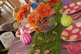 Para conseguir aún más el efecto deseado, sobre el camino de mesa hecho con césped puedes esparcir algunas florecillas y colocar un centro de mesa hecho con flores naturales. Una vajilla alegre y vasos de colores harán el resto.