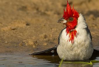 En la primer toma puede ver al cardenal en pleno baño, en primer lugar hablo acerca de la técnica, el bajar nuestro punto de vista al mismo nivel que el del ave nos permite lograr ese primer plano desenfocado gracias a tirarnos cuerpo a tierra, eso siempre si lo hacemos de manera lenta para no asustarlo y que el pájaro continúe con lo que estaba haciendo sin sentirse perturbado por nuestra presencia.