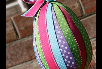 Stacy te explica cómo hacerlo con cintas de tela y un poliespán con forma de huevo. Imagino que también se podría hacerlo con dos globos de látex (mete uno dentro del otro antes de inflar los dos juntos, así la base sería más duradera). Y si no tienes cintas de tela, también quedaría genial con cinta washi.