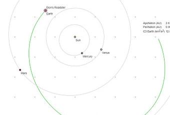 Trayectoria del coche hasta la órbita cercana de Marte y el cinturón principal de asteroides