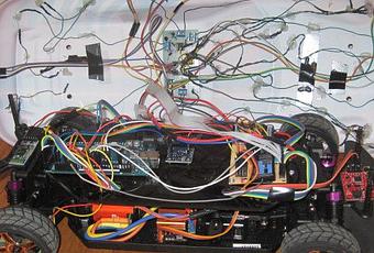 El diseño de la electrónica dentro del coche debe ser muy familiar para cualquiera que haya usado Arduino al prototipo de un proyecto. El Arduino MEGA conecta con tres sensores ultrasónicos, dos de los cuales están montados en la parte delantera del coche y uno en el parachoques trasero.Tres IR sensores también se conectan e a la MEGA y se despliegan de una manera similar. Un giroscopio y 9 tableros de medición inercial grado de libertad completan el paquete de sensores, pero se colocan dentro del chasis del vehículo.