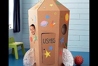 Con el frio polar que parece que se avecina para este fin de semana, lo mejor será buscar juegos y diversión en casa. Os proponemos la construcción de un cohete espacial. Sólo necesitáis una caja de cartón grande, tijeras, papeles, pinturas y mucha imaginación. La parte de arriba de la caja se cierra tal y como veís en la foto, hacéis una mini puerta para entrar y unas ventanitas redondas y la decoraís a vuestro gusto.