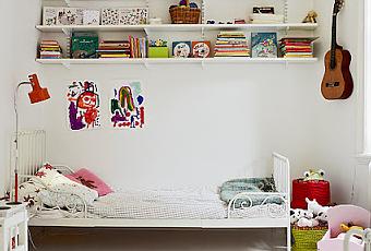 Algo arriesgado pero se puede. En esta casa los dos niños duermen juntos en una habitación amplia con grandes ventanales y techos altos de tres metros. El suelo es de madera pintado en blanco al igual que las paredes. Tienen espacio para sus dos camitas con aire retro de Ikea modelo Minnem y una zona de juego donde tienen una mesa de madera con sus sillas. Del techo cuelga una lámpara de papel y del cabecero un flexo estilo industrial para una luz más cálida. El total white del cuarto lo rompe el color de la guirnalda de la ventana, los juguetes ordenados en las baldas, las cestas de mimbre de colores y los cojines y sábanas de diferentes estampados. No podía faltar la mantita de ganchito en los pies para rematar la decoración de esta habitación sencilla pero con mucho gusto en la que los niños disfrutan a su aire, ¿no os lo parece?