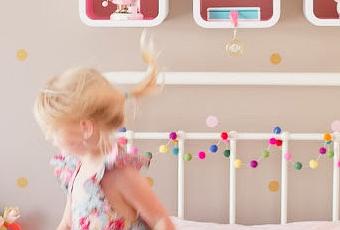 Esta es la preciosa habitación que Belinda Kurtz, diseñadora de interiores para niños, ha hecho para una de sus hijas. La clave en este espacio de tan fuerte personalidad, se ha basado en incluir unos cuantos tesoros de segunda mano renovados, como las dos mesitas auxiliares o el sillón pavo real, trasformados gracias a varias capas de pintura en spray, y de completar el conjunto con un montón de detalles divertidos como los stickers de pared, algunas piezas textiles alegres y versátiles, como los cojines o cesta para los juguetes, un par de guirnaldas de pompones, o la lámpara de papel, que fue un proyecto que madre-hija hicieron juntas. Puedes encontrar donde fueron adquiridas gran parte de estos artículos visitando el post original