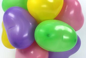 Infla 12 globos con aire, y átelos juntos en dúos. Junta dos dúos, y tuerce para entrelazar los centros de la unión. Sigue añadiendo dúos, torciendo y entrelazando, hasta conseguir una forma de esfera. Procura que los colores estén bien repartidos (¡es un poco como hacer el puzle de Rubik al revés! En vez de juntar colores, ¡tuerces para apartarlos!).