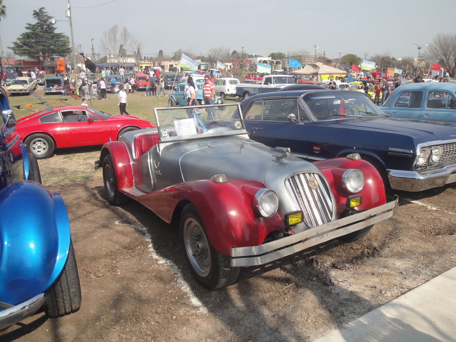En muchos pueblos de todo el país los predios, o playones, o estaciones ferroviarias quedaron a la buena de Dios. En este caso, por suerte, el tren funciona y el predio lindero a la estación se ha convertido en un parque. Que este año le han construido una pasarela de cemento peinado para poder realizar actividades aeróbicas. No todo está perdido. Ahí es donde se realizó el encuentro el domingo 30 de agosto.Muy alegre se puso Noberto Núñez al conocer la noticia que la Mercedes podría ser de la partida para Los Cardales ese domingo fijado en la agenda de encuentros en la provincia de Buenos Aires. En un principio seríamos unos tres autos, o más, los que marcharíamos en caravana, desde San Miguel, al pueblo de Los Cardales. Pero como siempre pasa algunos defeccionan.Una réplica de un Morgan. Detrás estaba ingresando un Puma brasileño de color rojo. La fotografía fue tomada el domingo 30 de agosto de 2015 en el encuentro llamado "El Desafío" organizado por el club Autos Clásicos Los Cardales.