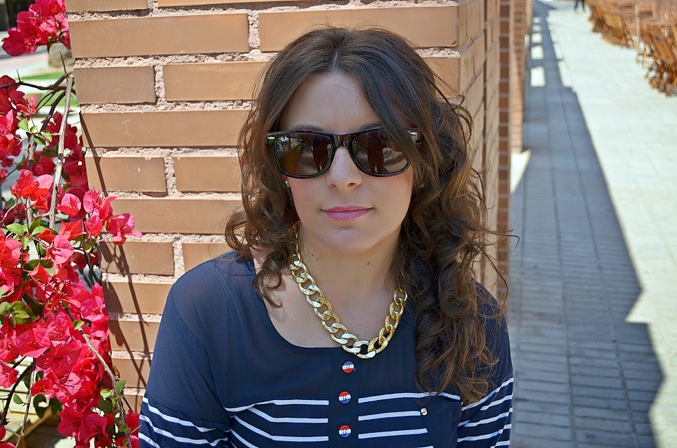 Unos jeans blancos ripeados con una camiseta de rayas navy. La camiseta es muy fresquita porque en la parte superior (donde no hay rayas) es de tul, y le da un toque más fresco al look.Los zapatos ya os los he mostrado en otros outfits. Los compré en Primark no hace mucho y los llevo muy agusto porque llevan muy poquito de tacón y son perfectos para los días de grandes caminatas.