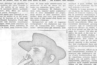 José Domínguez “El Cabrero” ha venido a desafiar nuestra sofisticación. Sin micros, sin luces ni trampas. De su voz, de sus gestos y de sus manos desborda la energía. ¿Qué nos aportaba ese rudo campesino? Un flamenco que no tiene nada que ver con las españoladas servidas en los cabarets. Una música rotunda que tiene sus reglas y tradiciones y además muy difícil de cantar.