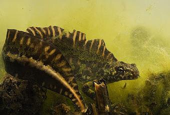 Sólo con acercarse a una charca o a un bebedero de ganado podremos encontrarnos con animales, como este tritón jaspeado (Triturus marmoratus), que no sin demasiada imaginación nos recordarán a los gigantes del Jurásico.