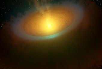 La ilustración representa la nube en expansión de vapor de agua fría que los astrónomos han detectado en el creciente sistema solar cercano a la estrella TW Hydrae. El vapor de agua fría puede eventualmente entregar océanos a los planetas secos que se están formando en el sistema. (NASA)