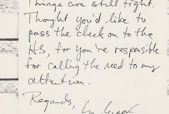 Lo encontró en una caja que tenia guardada en el ático: Es una fotocopia de una carta ,y de un cheque, enviada al padre de Matt por parte de TSR Inc (Con la firma del propio Gary Gygax), donando 500 dólares US (Una pasta, la verdad, a primeros de los 80) al fondo para ordenadores del instituto en el que cursaba estudios en aquellos años (Beloit Catholic High School, de Beloit, en Wisconsin), con fecha del 28 de diciembre de 1982.