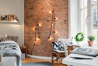 Me gusta cada rincón de este dormitorio, empezando por la pared de ladrillo y la cuerda de luces que cuelga, la claridad que entra por la ventana con sus maceteros y la silla para leer, todos los cojines y mantas que visten la cama, el escritorio…