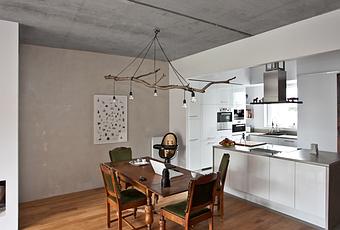 # Los Detalles: Lo más bonito de este duplex, además de la acertada combinación de madera y hormigón son estos dos detalles. La lámpara colgante sobre la mesa de comedor realizada con una rama de árbol y el mueble de TV con cajas de fruta recicladas.