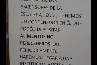 "Recordamos que en el antiguo rellano de los ascensores de la escalera izda. tenemos un contenedor en el que podéis depositar alimentos no perecederos que periódicamente haremos llegar a una institución asistencial".