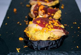 Berenjenas melosas con salmorejo de aguacate jamón de pato y ralladura de naranja.html