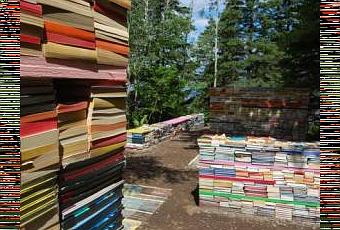 Paisajismo sujerente hecho de paredes y alfombras de libros.