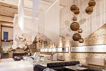 Nobles cortinas de hilo, de hasta cinco metros de largo, cuelgan encima de las islas de asesoramiento y sirven como particiones programáticas en el espacio.