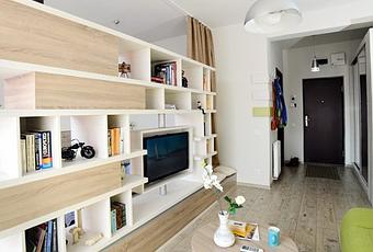 El apartamento es sencillo, pero con una decoración moderna y cuidada llena de detalles. El mueble estantería del salón hace de separación con el dormitorio y el pequeño despacho, dejando pasar la luz, y eliminando la sensación de agobio que nos podría ocasionar un estudio de reducidas dimensiones a la vez que proporciona algo de intimidad a la zona de descanso.