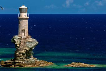 El faro Tourlitis es un singular faro de la costa de la ciudad portuaria de Andros. Se alza en la cima de una piedra, el faro se ve como algo salido de una novela de fantasía.