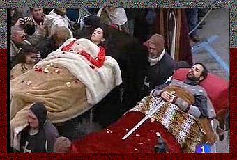 Ahí, en la esquinita de arriba a la izquierda, se ve un trozo de mi sobrino (vestido con capa blanca, de caballero teutón) justo cuando el cortejo pasaba por nuestro lado; es una imagen del telediario de la 1 de TVE (que por cierto, han bautizado a la ciudad y la han llamado "Tereruel").