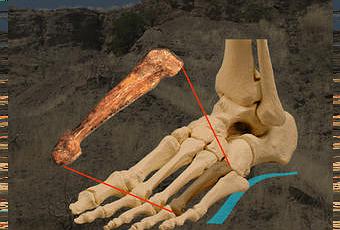 - Esta imagen muestra la posición del cuarto metatarsiano de un Australopithecus afarensis el cual se se recuperó en Hadar, Etiopía, en un esqueleto de pie. Crédito: Carol Ward y Congdon Kimberly