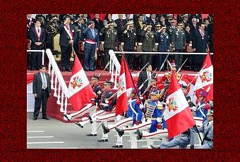 En la imagen que ilustra el post, militares peruanos disfrazados con uniformes de época remedan el paso de la oca prusiano. En la tribuna presidencial, un selecto ramillete de quienes acaso fueron los "perros" compañeros del cadete El Poeta (Vargas Llosa) en el Leoncio Prado.