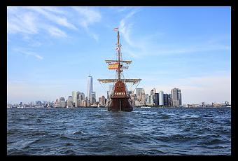 Paseo en bicicleta por el excelente carril bici del Hudson River Park. A la altura de la calle cincuenta, mis ojos, ya acostumbrados, ni siquiera se levantan del asfalto para fijarse en el Intrepid, el mastodóntico portaaviones de la marina norteamericana que desde hace décadas hace las veces de museo flotante. Sin embargo, unos metros más abajo, de repente, intuyo lo que parece un mástil de un velero. Debajo del mismo adivino la figura de un barco de madera, pero no es un barco cualquiera: ¿una carabela? ¿una galera? ¿una carraca? ¡Atracado en el río Hudson!¡y con bandera española! Demasiado como para no ir a cotillear.