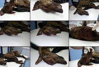 Tanto Huellas como los veterinarios que le atendieron, pensamos que alguien le dió un fuerte golpe en la cabeza y como no lo pudieron matar, le colgaron. Debido al golpe, sufría una fuerte hemorragia por boca y nariz y los ojos los tenia ensangrentados por el derrame. No se pudo hacer nada por el salvo concederle una muerte digna y que dejase de sufrir, evidentemente hubo que eutanasiarle . Por supuesto no tenía microchip!!
