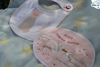 Natalicio y babero forman un conjunto, pero como me recalcaron que no era necesario que todo fuera a juego, he emparejado artículos pero sin exagerar.