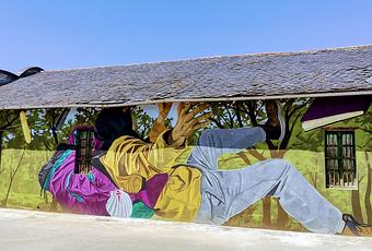 Una obra del equipo Chisme.criu, formado por Asier Vera y Víctor Rodríguez, representa a la entrada del municipio de Cabañas Raras el Camino Olvidado que cruza la población y al que los municipios por los que pasa quieren potenciar para que vuelva a ser transitado por peregrinos con alternativa al paso tradicional del Camino Francés.