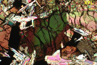 Izquierda: Microfotografía de una delgada sección de la muestra lunar 14053. Crédito: Larry Taylor/Universidad de Tennessee.