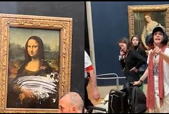 La Mona Lisa, atacada en el Louvre por un tartazo lanzado por un falso anciano en silla de ruedas.