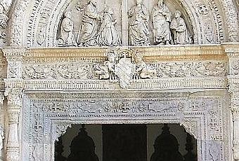 Ésta se caracteriza por un vano adintelado guarnecido de finos relieves con escudos cardenalicios y cruces de Jerusalén, entablamento interrumpido por dos ángeles portando el escudo del Gran Cardenal, tímpano con el tema de la Cruz adorada por Santa Elena, San Pedro y San Pablo y dos pajecillos y arquivolta cubierta de cruces, querubines y ángeles bajo doseles góticos descansando sobre columnas.