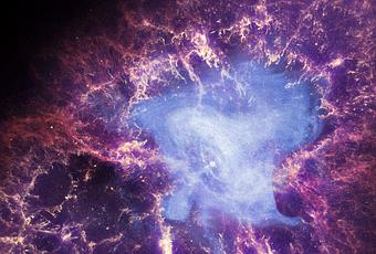Se observó la muerte espectacular de una estrella en la constelación de Tauro en la Tierra como la supernova de 1054 DC. Ahora casi mil años más tarde, un objeto muy denso, llamado estrella de neutrones, resultado de la explosión, despidió una tormenta de partículas de alta energía en el campo de escombros en expansión conocida como la Nebulosa del Cangrejo. Datos de rayos X de Chandra proporcionan pistas importantes para el funcionamiento de este poderoso generador cósmico, que es la producción de energía a razón de 100.000 soles. Esta imagen compuesta utiliza datos de tres grandes observatorios. La imagen de rayos X del telescopio espacial Chandra se muestra en azul, la imagen óptica del telescopio espacial Hubble está en rojo y amarillo, y la imagen infrarroja del telescopio espacial Spitzer es de color morado. La imagen de rayos X es más pequeña que las otras porque los electrones extremadamente energéticos que emiten rayos X irradian su energía más rápidamente que los electrones de baja energía que emiten luz visible e infrarroja.