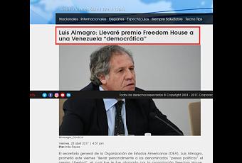 El secretario general de la Organización de Estados Americanos (OEA), Luis Almagro, no tuvo ninguna vergüenza al recibir este jueves el premio "Libertad" de manos del Freedom House, (FH) una organización no gubernamental digitada por la central estadounidense de inteligencia CIA, que continúa asesorando y financiando a la derecha latinoamericana en estrategias de guerra sicológica.