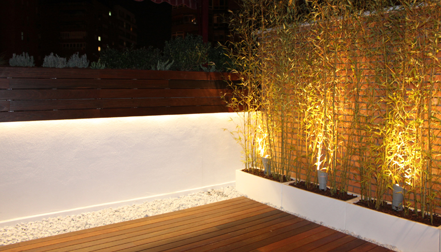 Los jardines urbanos en áticos y terrazas se disfrutan especialmente durante la noche cuando la primavera ya invita a salir a cenar a la terraza y cae el calor de los días del verano. Normalmente llegamos de trabajar cuando ya ha caído la noche por eso es fundamental tener una buena iluminación en terrazas y áticos. El jardín y las plantas precisan de una iluminación suave y sutil que consiga crear una atmósfera mágica en nuestros espacios exteriores.