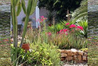 En una de las zonas más áridas de la Península se encuentra el Parque Natural de Cabo de Gata, en la provincia de Almeria. Un verdadero oasis gracias a la preciada ausencia de edificaciones al borde del mar, un paraje desértico en el que disfrutar de un paisaje diferente y del mar contrastando con la rudeza de las montañas.Y, como siempre, buscamos jardines con ese toque especial en su concepción y diseño. El que os enseñamos hoy está situado en Rodalquilar en uno de los muchos alojamientos que en la zona se pueden encontrar y tiene la especial cualidad de enseñarnos que incluso en las condiciones más adversas la naturaleza nos ofrece la posibilidad de tener un bonito jardín.