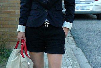 Americana de Mango, Short de Zara, Bolso Bimba & Lola, Cinturón Mango y Zapatos Blanco.