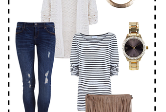 He combinado, una camiseta de rayas marineras. Con unos tejanos lavados, en azul oscuro. Combinado con un cárdigan calado de color hueso o blanco roto. En los pies no podían faltar unas Converse de color blanco. En mi armario tengo diferentes modelos, me encantan lo bien que combinan tanto con pantalones como con faldas. En los complementos, y para contrastar con la ropa, te quedará genial un bolso de mano en marrón y complementos en dorado. Atrévete con los flecos esta temporada vuelven a estar de moda.