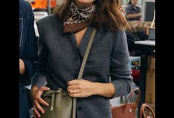 Uno que me encanta, no solo por la falda de punto sino por el blazer combinado con pañuelo y la gestión de colores.