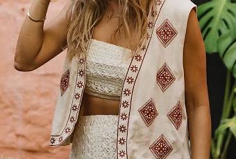 Este tipo de pantalones bordados o de crochet, camiseta básica y camisa a juego, cómoda y perfecta.
