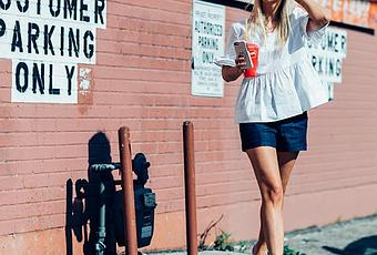 Mini denim y blusa blanca con escote off the shoulders, fresco y fantástico para un domingo de no parar en casa.