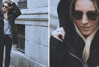 Empezamos con un look muy básico pero que nos salva del día a día, que no todo son ocasiones especiales o fiesta. Cómodo y calentito, parka negra con capucha, botas altas y jersey básico, perfecta!