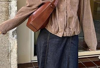 Uno que me ha gustado por lo diferente, falda vaquea, cazadora de ante y bolso ideal.