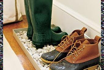 Ya han llegado las primeras lluvias y aunque nos resistamos en un mes aproximadamente sacaremos de nuevo la ropa de abrigo, los paraguas y las botas de agua. Todas nos preparamos para el mal tiempo y el agua, por ello hoy queremos compartir con vosotras una idea que hemos encontrado en la web de Martha Stewart y que sirve para dejar los zapatos mojados y llenos de barro en la puerta de casa.Para crear este soporte para dejar nuestros zapatos necesitaremos una bandeja que tenga algo de profundidad, lo mejor esque sea de plástico pero si teneis alguna de metal a mano también nos puede servir. A continuación rellenaremos la bandeja de piedras o cantos de río y..... ya tenemos nuestro lugar para dejar nuestras botas y zapatos los días de lluvia.