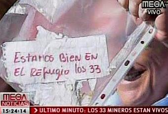 Un milagro. Así ha calificado la prensa la noticia de que los 33 mineros atrapados en la mina San José, al norte de Chile, se encuentran con vida tras pasar 17 días enterrados a 800 metros de profundidad. La información fue confirmada por el presidente Sebastián Piñera, quien mostró una nota escrita con lápiz rojo que le alcanzaron a los rescatistas desde el fondo de la mina "Estamos bien en el refugio los 33".