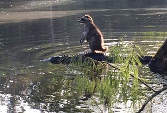 No, sus ojos no lo están engañando a usted. Este es de hecho un mapache de pie encima de un cocodrilo.